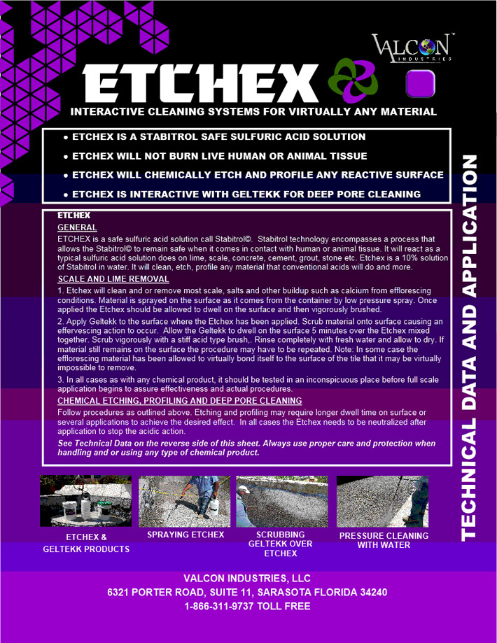 ETCHEX is designed to be chemically reactive to alkaline materials to chemically react opening the profile of such surfaces. When used with GELTEKK the ETCHEX will effervesce materials out of the pores and neutralize the acidic activity.